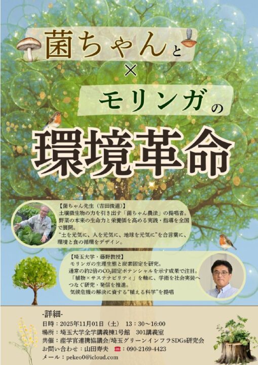 【編集局】「菌ちゃんとモリンガの環境革命」と題して埼玉大学(桜区下大久保)で、ユニークな講座が公開されます。土の中の「菌」と、不思議樹木「モリンガ」が環境革命を起こすとは、どんなことなのでしょうか。いま注目されている、この研究の現状を知ることができる待望の講座にご期待ください!