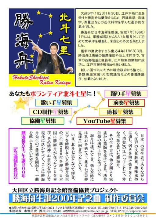 「北斗七星勝海舟」の歌手になりたい方を募集します。上をクリックしてメールでお気軽にどうぞ。
