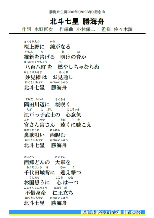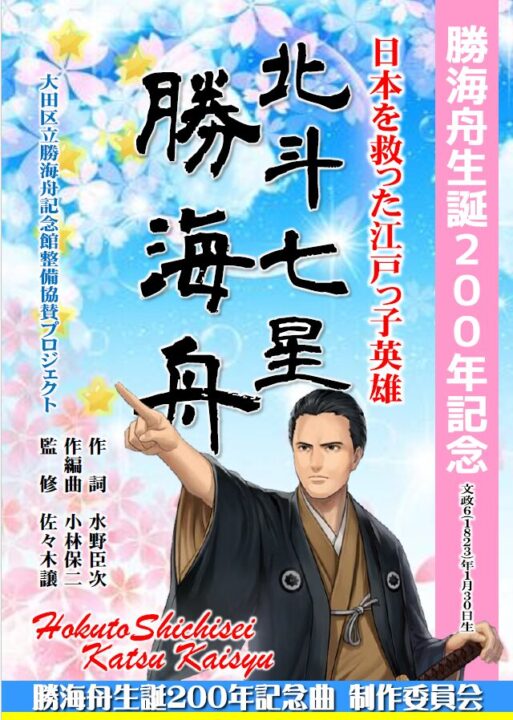 本紙編集局長の水野臣次(作詞)と本紙文芸局の小林保二(作編曲)コンビによって、勝海舟生誕200年記念曲「北斗七星 勝海舟」が誕生しました。本紙文芸局長の細沼初美(オペラ歌手)が江戸前の気風で朗々と歌い上げます。この現代にこそ必要な勝海舟の思想・哲学・心意気。西郷隆盛が、唯一「先生」と呼んだ勝海舟の生き方は、時代を生きる私たちに新たな希望と展望を与えてくれます。