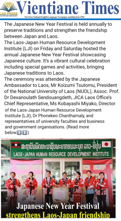 1月16日金曜日と17日土曜日に、日本の文化を紹介する毎年恒例の日本のお正月祭りが開催された。催事のメインは17日土曜日、ゲームやデモンストレーションなどを披露しつつ、日本の伝統をラオスに伝えるお祭り。なお、開会の式典には、小泉勉 在ラオス日本大使、ラオス国立大学(NUOL)のデサノラット・セネデュアンデット学長、JICAラオス事務所の小林美弥子所長、ラオス日本センター(LJI)のポーンケオ・チャンタマリー所長、そして、同大学各学部、企業、政府機関の代表が出席した。