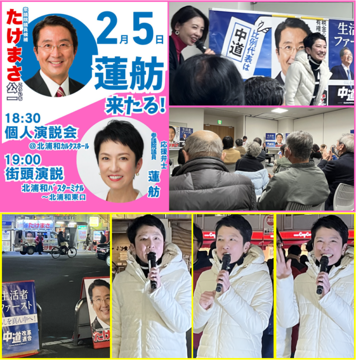 【総選挙特別取材班】2月5日、あの有名な蓮舫さんが、北浦和に来て講演会を開催し大好評、そのあと北浦和駅東口で、ごあいさつの活動を展開しました。駅頭に立っただけで、そこには花が咲いたような雰囲気が醸し出され、「あっ、レンホーだ」と通りがかりのサラリーマンや学生から盛んに握手を求められていました。