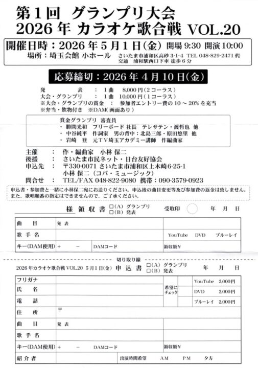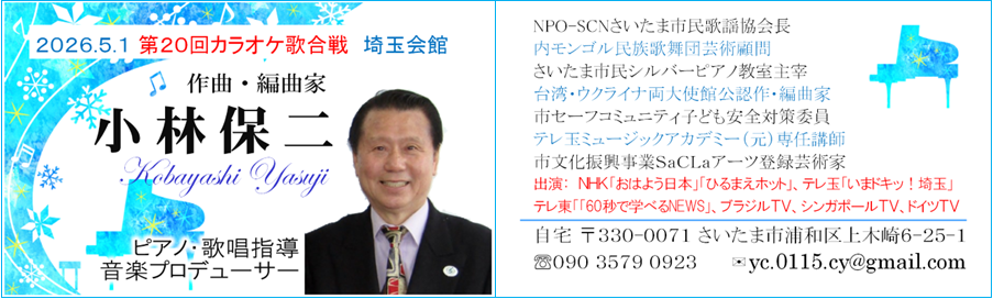 【文芸局】作曲・編曲家・歌唱指導者として、テレビ埼玉などで活躍する小林保二氏(浦和区)が、5月1日に埼玉会館小ホールで、同氏主催のカラオケ大会20周年を記念して、プロ歌手の道を拓く「第1回グランプリ大会」を開催します。