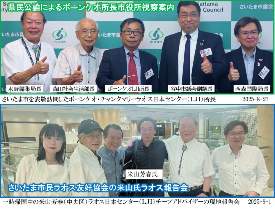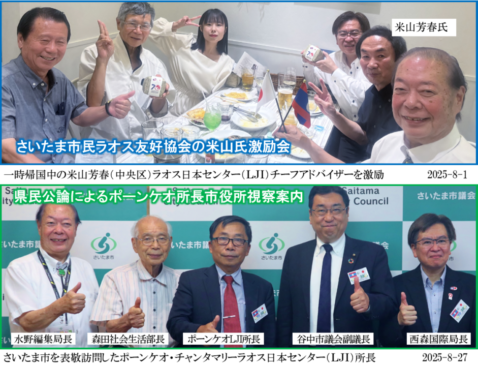 ポーンケオ チャンタマリー所長は2025年8月に、ラオスの「パートナーシップ都市」であるさいたま市を表敬訪問。これをさいたま市民ラオス友好協会と県民公論が受け入れて、さいたま市役所とさいたま市議会の視察のご案内をして、民間外交の花を咲かせました。また、米山芳春チーフアドバイザーは中央区に実家を置かれているとのことで、2025年8月に一時帰国された際に、激励交流会を開催させていただきました。ラオス国の第一線で、さいたま市民が活躍されているということは、市民にとっての名誉です。